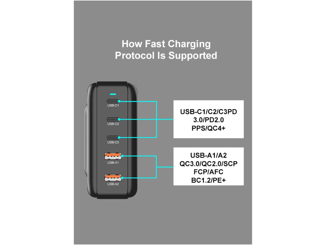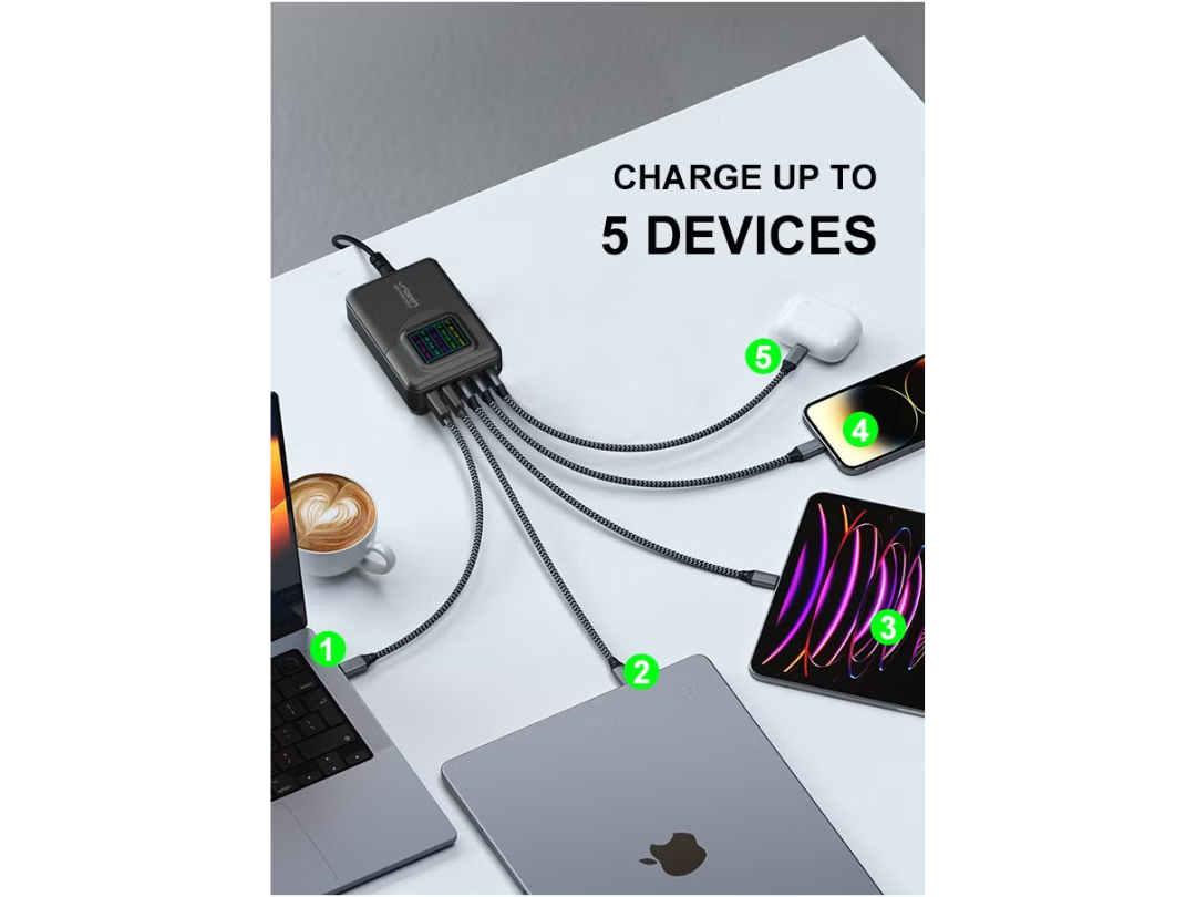 The URTECH 200W GaN Desktop Multi-Port Charging Station delivers powerful and efficient charging with its advanced gallium nitride technology. Equipped with 5 ports—3 USB-C and 2 USB-A—it supports fast charging, including a 100W Power Delivery output for high-demand devices. The smart LED power display lets you monitor real-time power distribution, optimizing your charging setup. Designed as a central hub, this charger efficiently powers multiple devices simultaneously, making it ideal for professionals who require reliable and versatile desktop charging solutions.